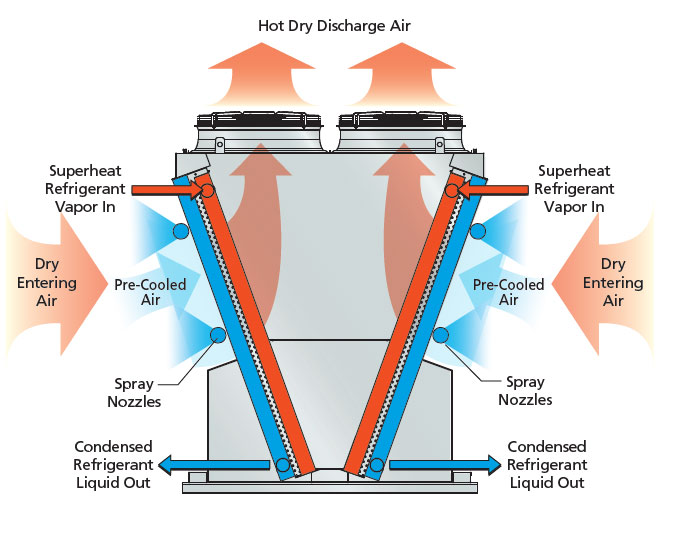 Когда температура окружающего воздуха начинает подниматься выше 27 °C, система распыления включается и распыляет воду наружу, против направления поступающего сухого воздуха. Входящий воздух будет снижать и поддерживать температуру воды на выходе (LWT) на уровне 35 °C.